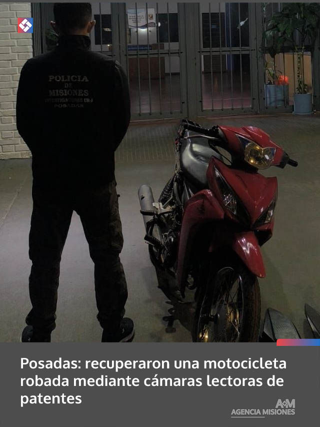 AGENCIA MISIONES.UNO | Efectivos de la División Investigaciones de la Unidad Regional I recuperaron anoche una motocicleta robada en la ciudad de Posadas, luego de que fuera detectada por el sistema inteligente de cámaras lectoras de patentes. El procedimiento se concretó alrededor de las 23:19 horas en la intersección de la avenida Jauretche y la Ruta Nacional 12, donde los agentes lograron interceptar el rodado.